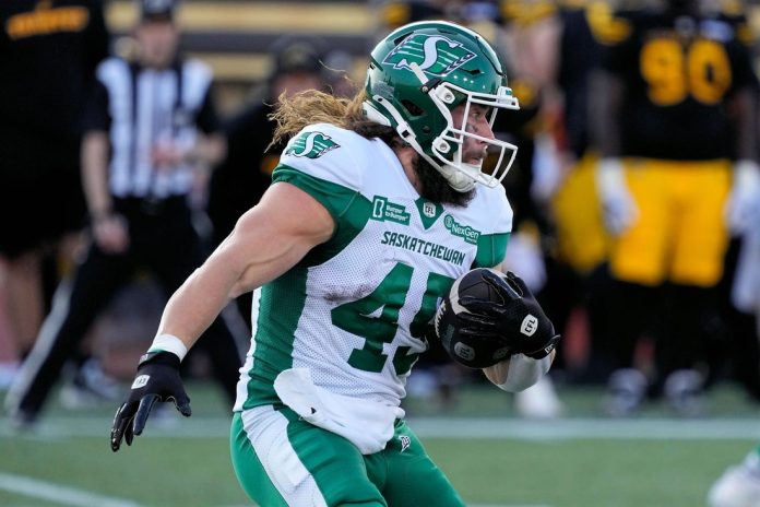 Saskatchewan coach Corey Mace said the offensive line has done yeoman duty while paving the way for Ouellette, who rushed for 115 yards and a score in last week’s 27-25 road loss against the Edmonton Elks.