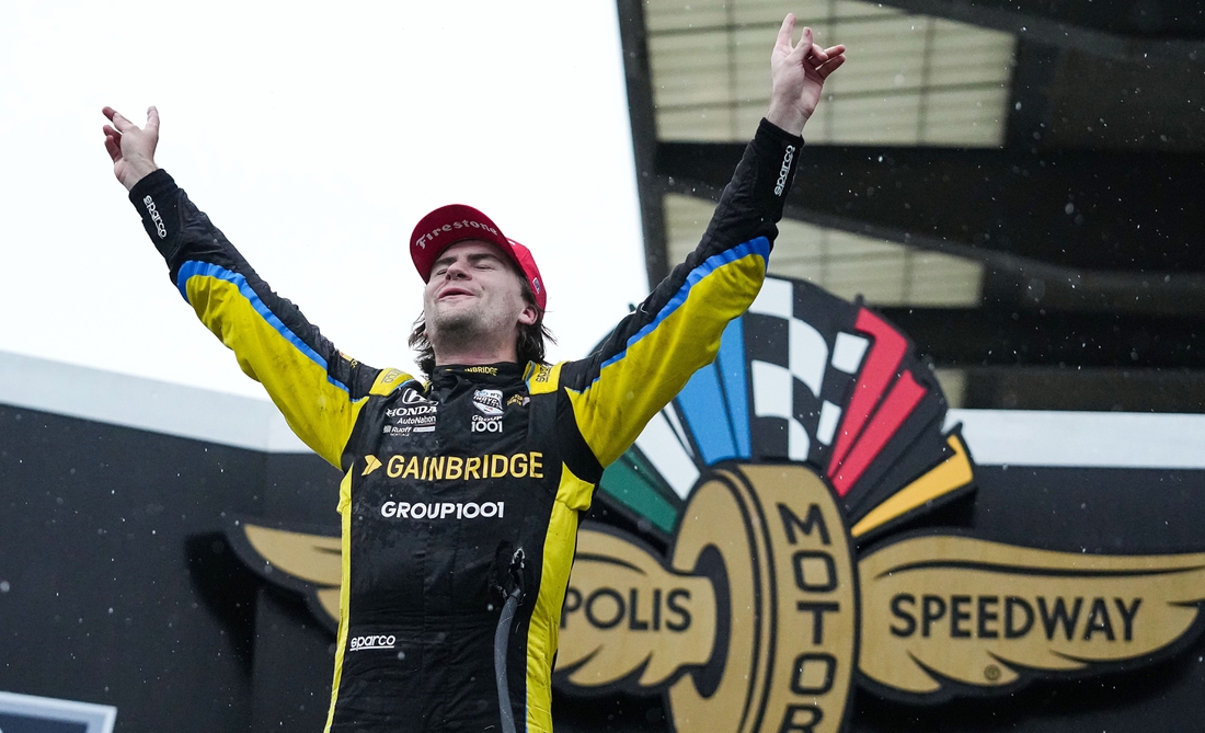 Colton Herta won his first race of the 2022 season on Saturday at the rain-soaked GMR Grand Prix at Indianapolis.