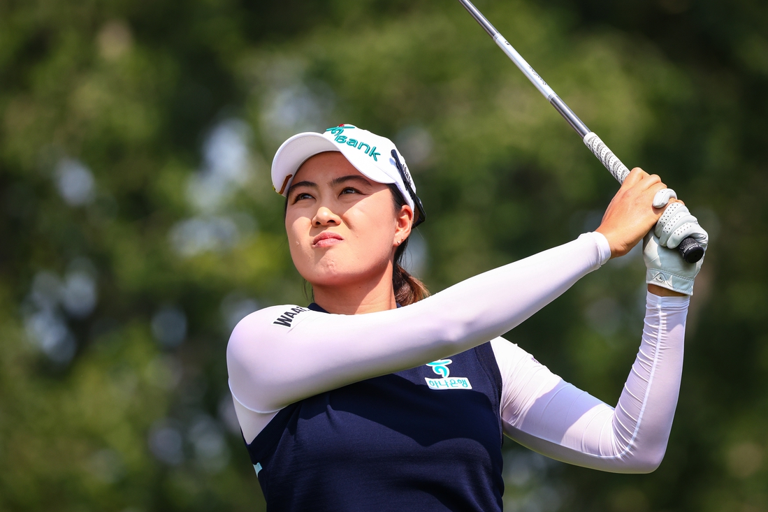 Earlier in the day, Khang stood near a puddle off the green and holed an unlikely chip-in birdie at the par-5 fifth hole, her 14th hole of the day, to take the lead. She made her sixth and final birdie of the day at No. 7 to set the lead at 4 under.