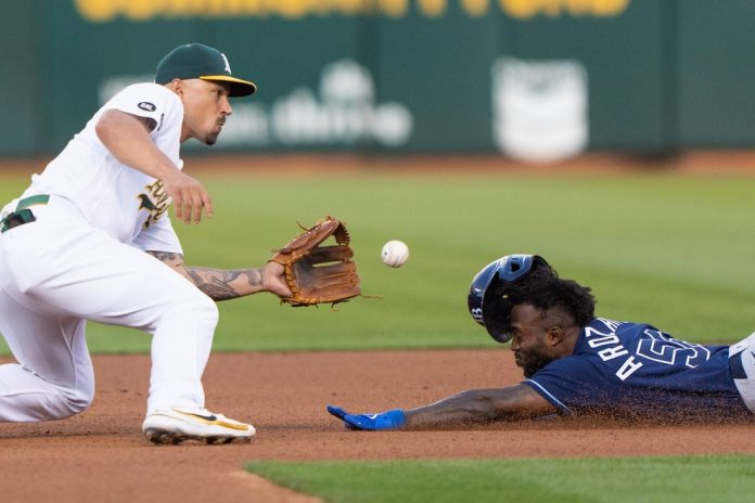 Tampa Bay arrived in Oakland on Monday not only with baseball’s best record but also with the league’s highest stolen-base total. After successfully stealing two bags on Monday in a 4-3 loss, the Rays had a key runner gunned down in a 2-1 defeat on Tuesday when Oakland catcher Shea Langeliers threw out Randy Arozarena for the second out of the ninth inning.