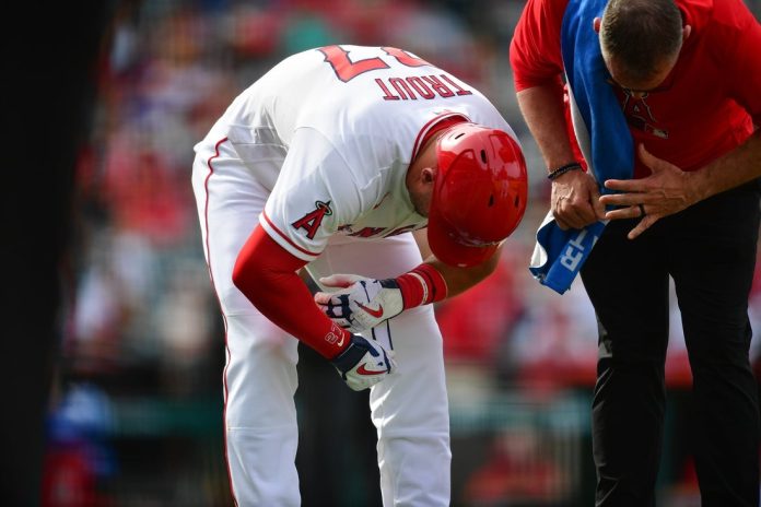 Trout left Sunday’s eventual 8-7 victory in extra innings against the Seattle Mariners when he was hit on the hand by a 94-mph pitch from Casey Legumina. Trout was visited by a team trainer at home plate after the eighth-inning incident and made his way to first base before leaving for a pinch runner.