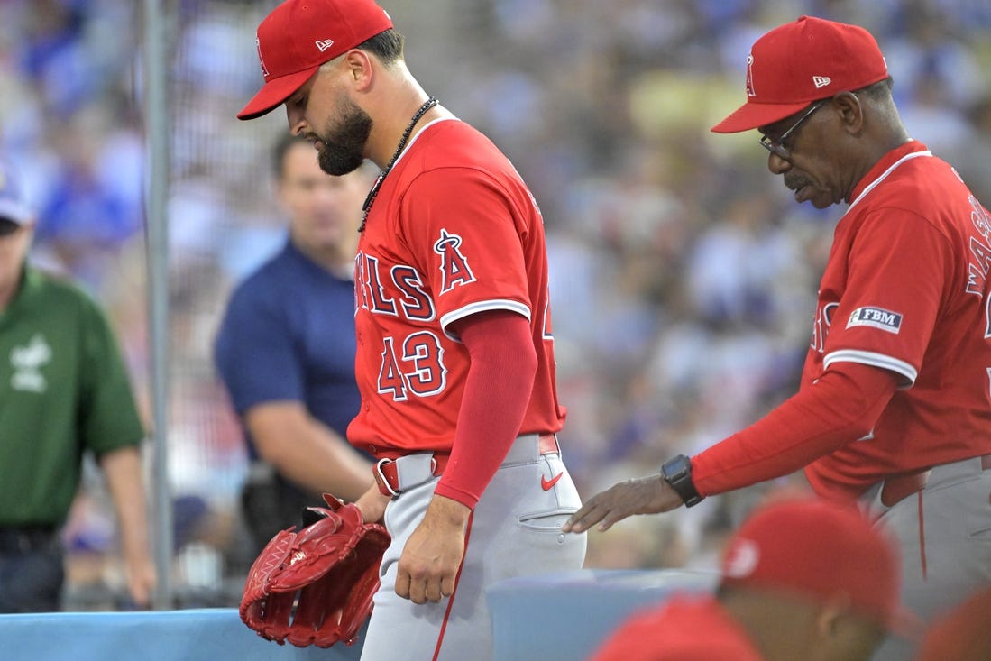 Los Angeles Angels left-hander Patrick Sandoval his Friday start against the Los Angeles Dodgers after 2 1/3 innings due to left forearm tightness.