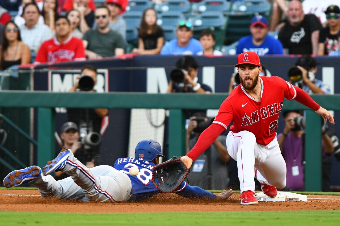 The Angels trailed 7-4 going into the bottom of the eighth but rallied against the Rangers’ bullpen with three walks and three hits. David Fletcher got the Angels to within 7-6 with a two-run double.