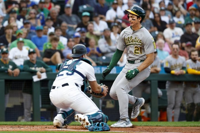 Shea Langeliers doubled home the go-ahead run with two outs in the top of the 10th inning as the Athletics defeated the host Seattle Mariners 2-1 on Saturday night.