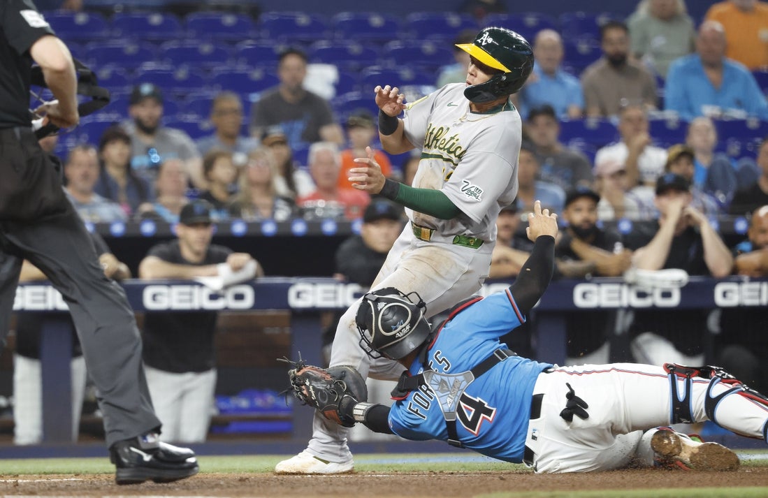 Neither starter earned a decision. Miami’s Edward Cabrera allowed seven hits, two runs and one walk with four strikeouts in 5 2/3 innings. JP Sears lasted 6 1/3 innings for the A’s, allowing two runs on four hits with two strikeouts and no walks.