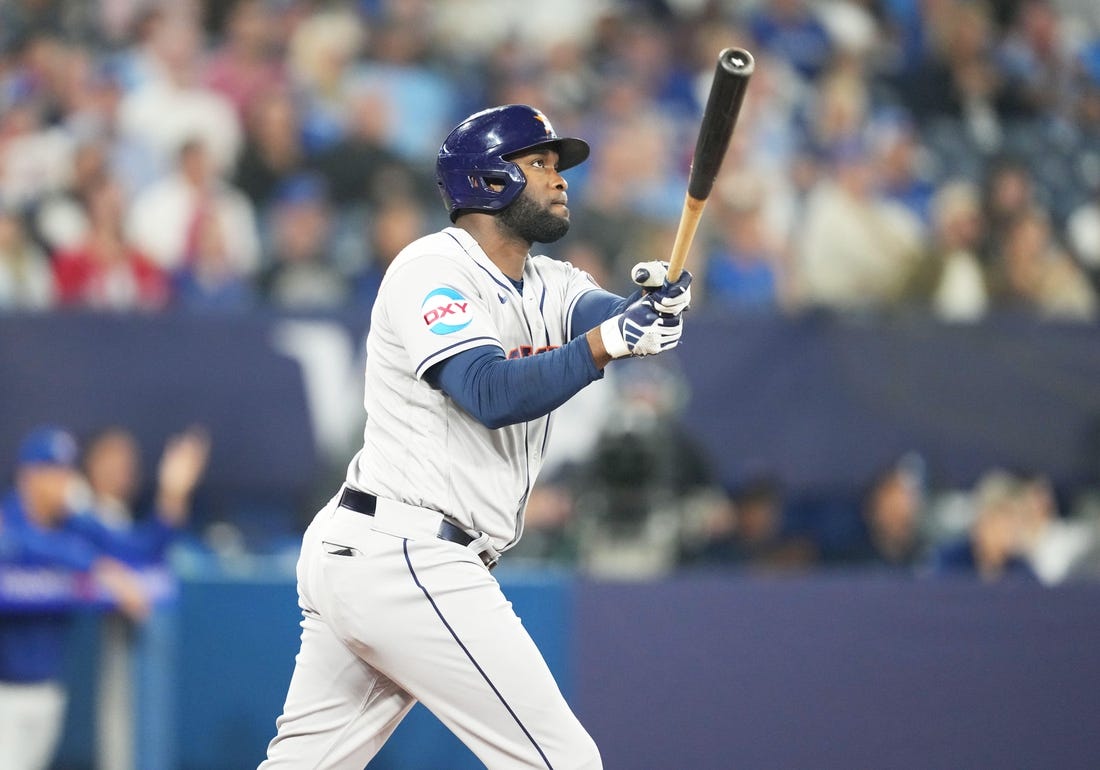 The 2019 American League Rookie of the Year in 2019 is batting .293 with 115 homers and 338 RBIs in 425 career games with the Astros.