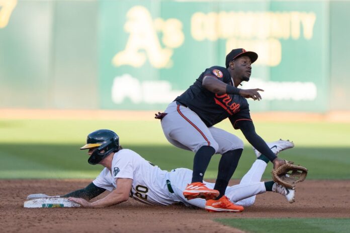 Facing a team that had pitched shutouts in its past two games, the Orioles wasted no time ending the streak with a run in the top of the first. Gunnar Henderson, who had led off the game with a single against A’s starter Hogan Harris (1-3), scored the run on a two-out throwing error by A’s catcher Shea Langeliers.
