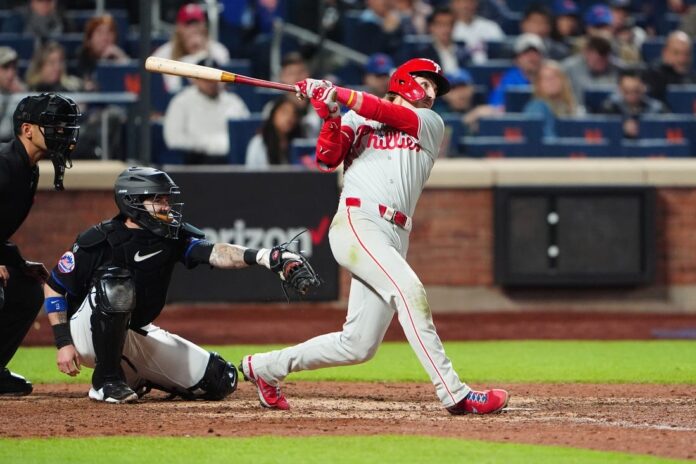 The two biggest bats remaining in the Phillies’ lineup didn’t put the ball in play in the last two innings. Bryce Harper struck out to end the ninth before opening the 10th as the automatic runner. Harper went to third after Sean Reid-Foley uncorked a wild pitch, and Nick Castellanos walked before Harper tagged up and scored on Stott’s sacrifice fly to right field.