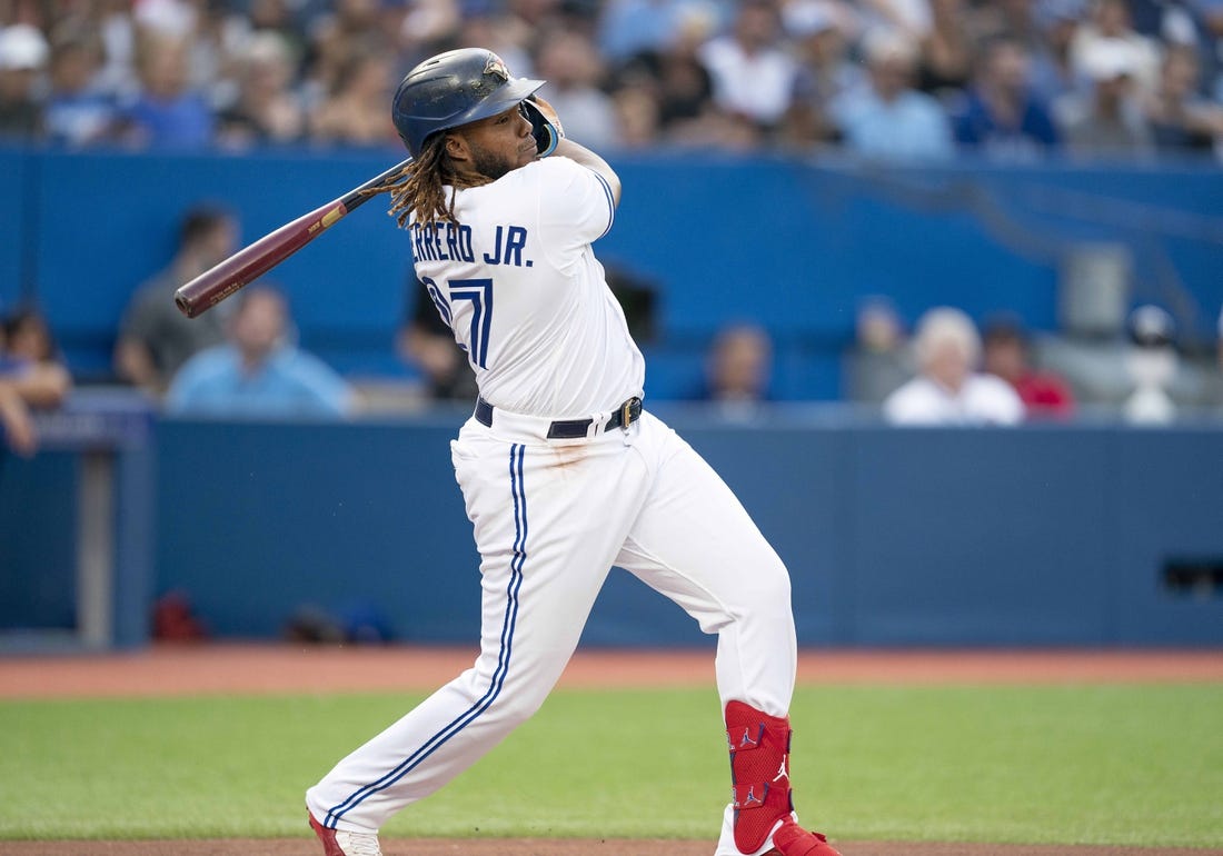George Springer reached first base with one out in the third on a throwing error by Javier Baez on a grounder to shortstop. He took second on a groundout and scored on Alejandro Kirk’s broken-bat single.