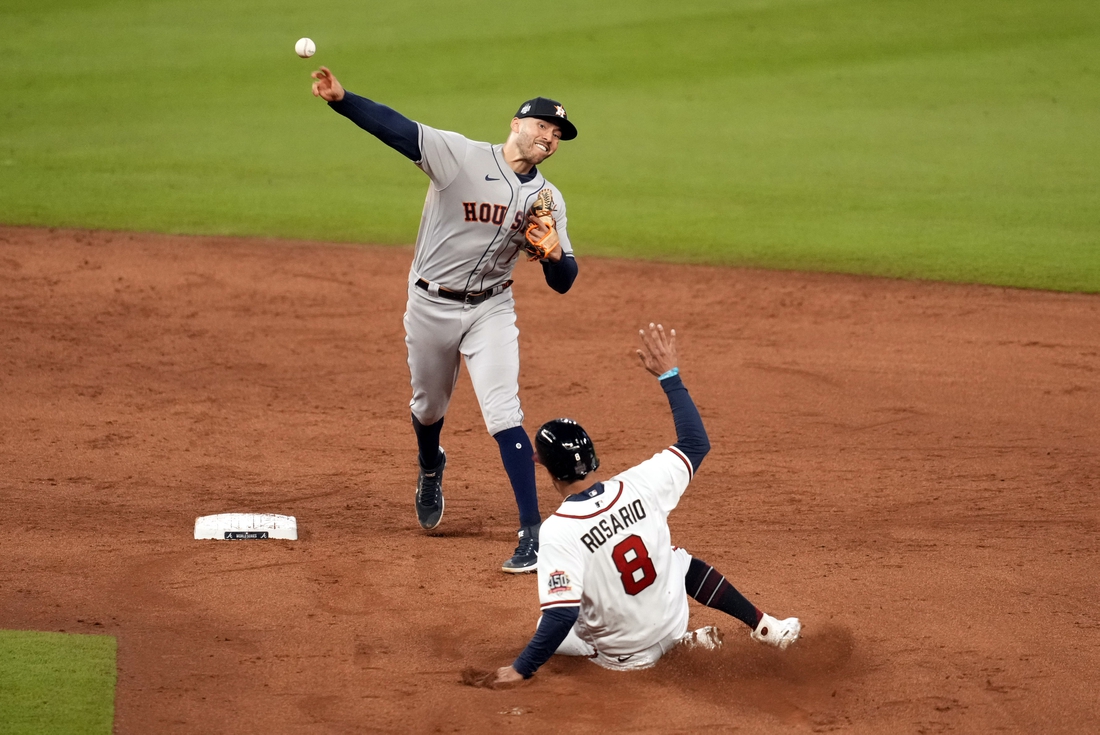 After recording just one out, Lee was replaced by right-hander Kyle Wright, who retired Carlos Correa on a groundout with Altuve scoring for a 1-0 Astros lead.