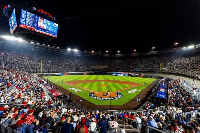 The Atlanta Braves and Cincinnati Reds couldn’t even complete one lap Saturday night at Bristol Motor Speedway during the first Major League Baseball game played in Tennessee.