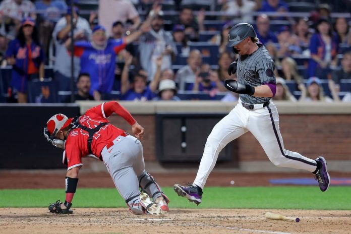 Yoan Moncada had trouble getting the ball out of his glove before firing wide to the third base side of O’Hoppe as Baty stepped around the Angels catcher to score standing up.