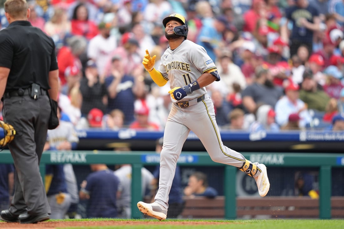 Chourio hit a grounder up the middle that went off the glove of diving second baseman Bryson Stott and into center for a two-run single that stretched the lead to 7-0.
