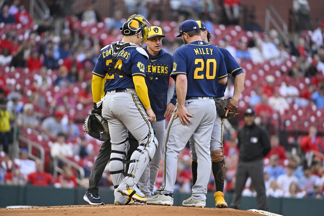 With a runner on first base and two outs, catcher William Contreras visited Miley on the mound. Miley attempted to continue, but he started his delivery, quickly stopped and then departed after consulting with the Brewers’ staff on the mound.