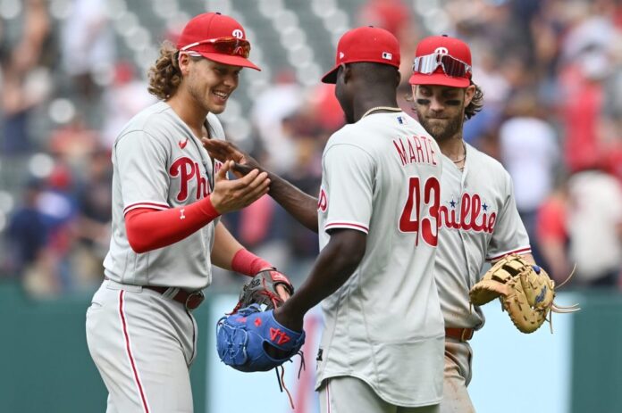 Kyle Schwarber’s RBI infield single and Harper’s run-scoring groundout in the fifth let the Phillies force a 3-3 tie. Brandon Marsh’s sixth-inning single to left off Guardians relief pitcher Nick Sandlin drove in J.T. Realmuto to break that tie.