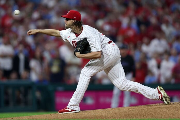 Phillies starter Aaron Nola (1-0) tossed seven shutout innings, giving up three hits and one walk while striking out three.