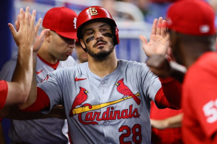 Cardinals third baseman Nolan Arenado left St. Louis’ game against the host Miami Marlins in the eighth inning on Wednesday after he was hit by a pitch on the right elbow.