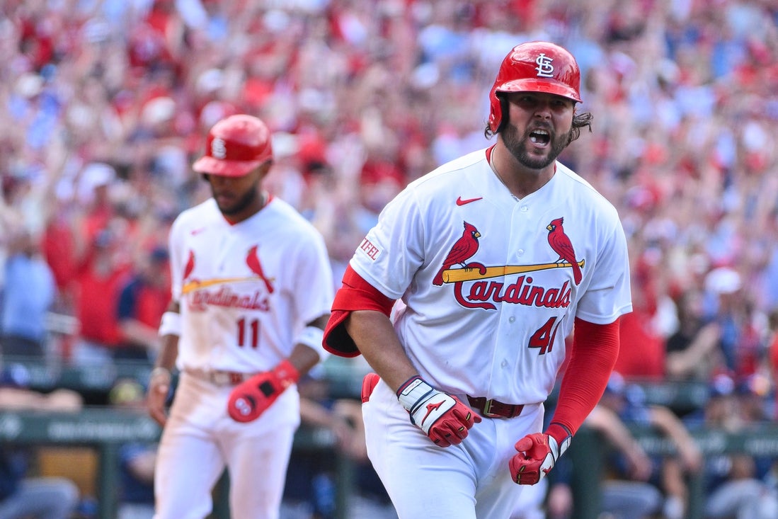 Alec Burleson highlighted his three-hit performance by belting a two-run homer to cap an eight-run sixth inning in the Cardinals’ 9-7 win over the Rays on Wednesday.