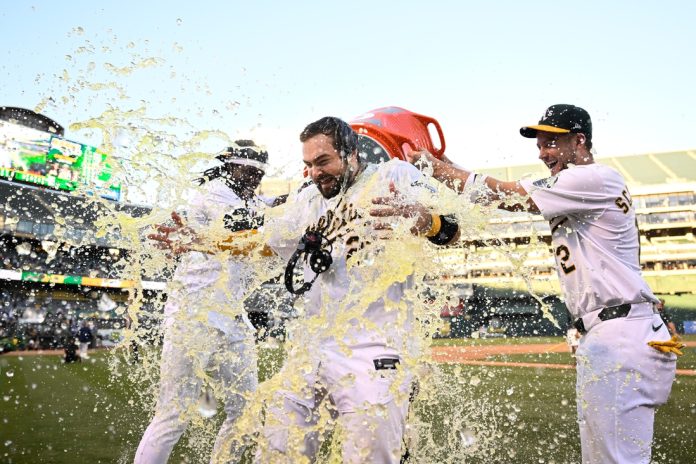 Langeliers was no sure thing to start Monday’s game after having been behind the plate for five of Oakland’s six games on a just-completed trip through the heat of Cincinnati and Texas. A’s manager Mark Kotsay noted he might have considered giving his ironman a day off if he didn’t know better.