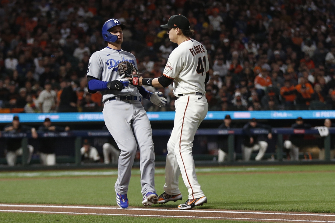 Kris Bryant had two hits for the Giants, who were the winningest team in the majors in the regular season with 107 victories. The Dodgers won 106 games in the regular season.