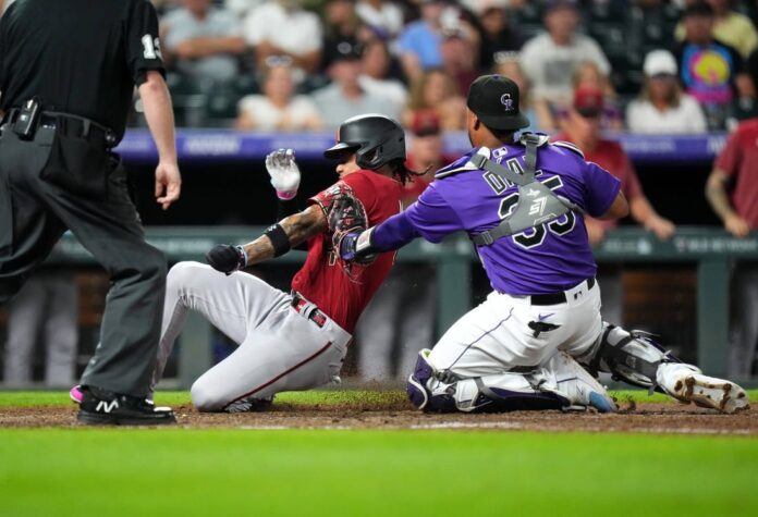 Elias Diaz’s wild pickoff throw to third allowed Perdomo to score, but Marte was thrown out at home trying to score from second.