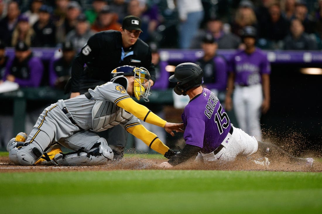 Freddy Peralta struck out the side in the second but ran into trouble in the third. With one out, Tovar homered to center — the Colorado rookie’s first homer of the season.