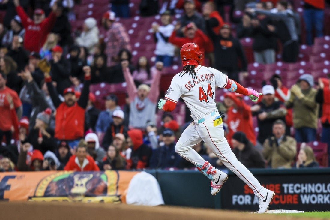 Elly De La Cruz hit two tape-measure home runs, doubled, singled and drove in a career-high seven runs to lead the Cincinnati Reds to a 14-3 rout of the visiting Texas Rangers Monday night.