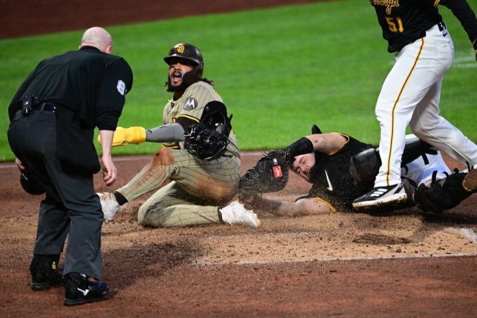 After hitting his double in the ninth off David Bednar (0-3), Tatis Jr. stole third. He then took a chance on a Bednar pitch that bounced and was blocked by catcher Joey Bart, bounding only a couple of feet away. Tatis Jr. got a great jump down the line and just sneaked under Bart’s tag. The play was reviewed and the original call was upheld to give San Diego its eventual winning margin.