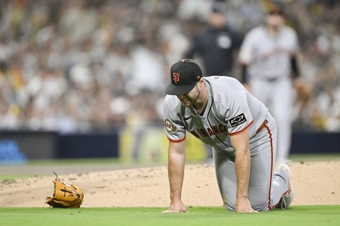 San Francisco Giants starting pitcher Landen Roupp was knocked out of Wednesday night’s game at the San Diego Padres in the bottom of the third inning after getting struck in the back of the right thigh by a line drive.