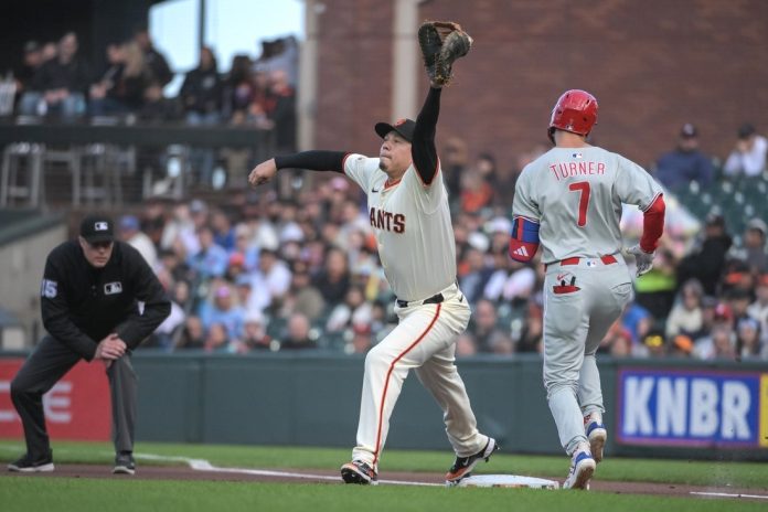 Matt Chapman had three hits and scored twice and the San Francisco Giants, scoring all their runs on infield outs, won a pitchers’ duel over the visiting Philadelphia Phillies, 3-1 in the opener of a three-game series Monday night.