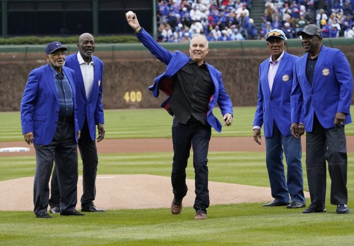 He threw out the first pitch, surrounded by fellow Cubs greats, before the team’s home opener on April 4.