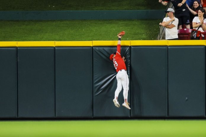 Friedl raced to the wall, timed his jump perfectly and brought the ball back over after it landed in the web of his glove for the game’s final out, sealing Cincinnati’s 4-2 win.