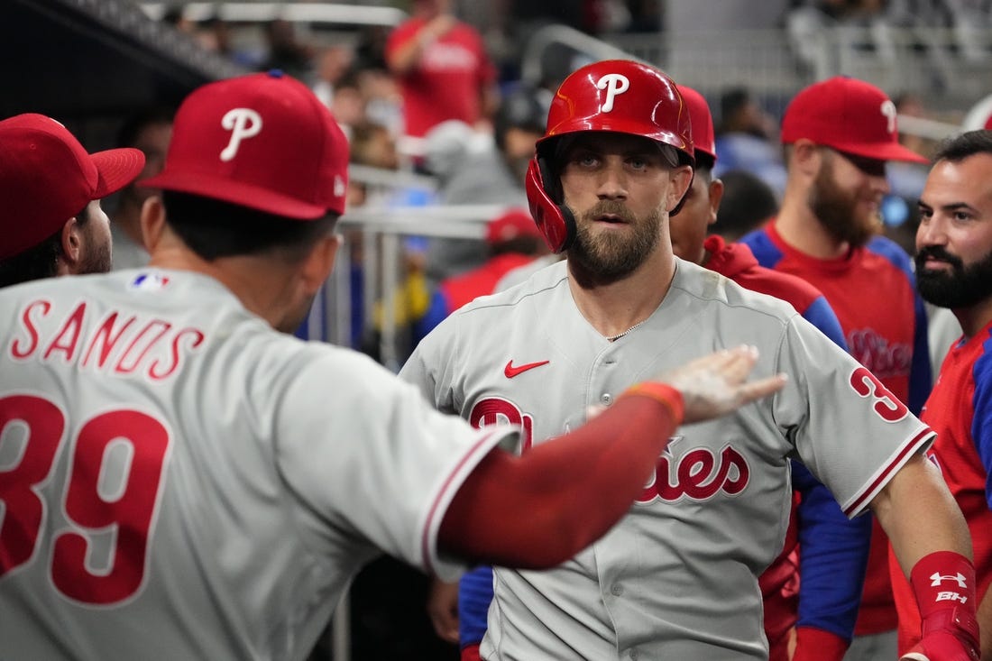 Realmuto added a three-run shot in the seventh for a 6-1 lead. Brandon Marsh singled, Harper drew a two-out walk and Realmuto homered off reliever Huascar Brazoban’s 98-mph fastball. The drive barely cleared the right field wall, traveling 352 feet.