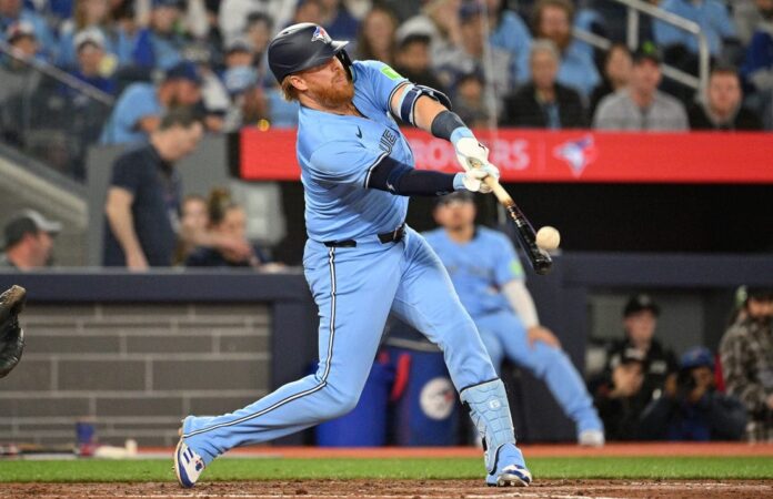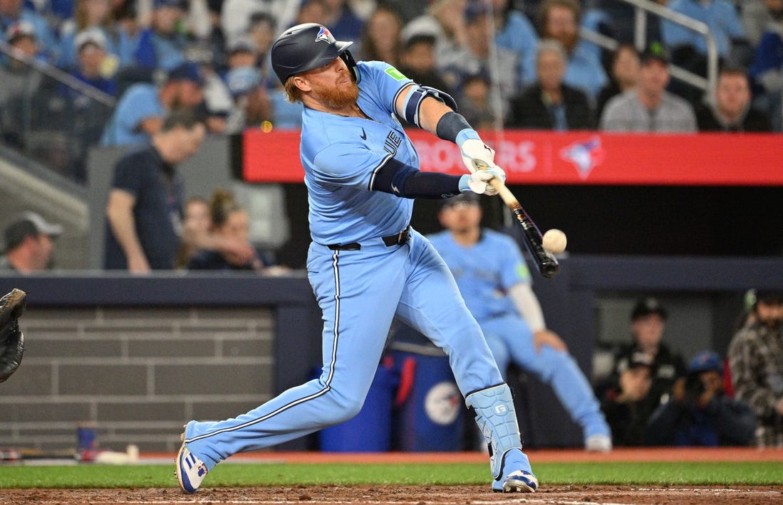 Justin Turner paced Toronto with two home runs and three RBIs in the opener against the Royals. Danny Jansen hit a solo homer, and Addison Barger singled for his first career major league hit.