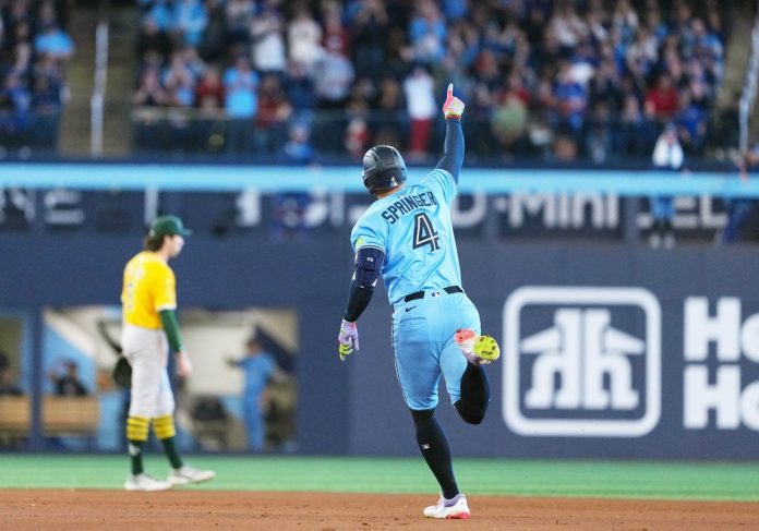 George Springer hit two home runs, and the Toronto Blue Jays held on Saturday for an 8-7 victory over the visiting Athletics, who scored two runs in the ninth inning.