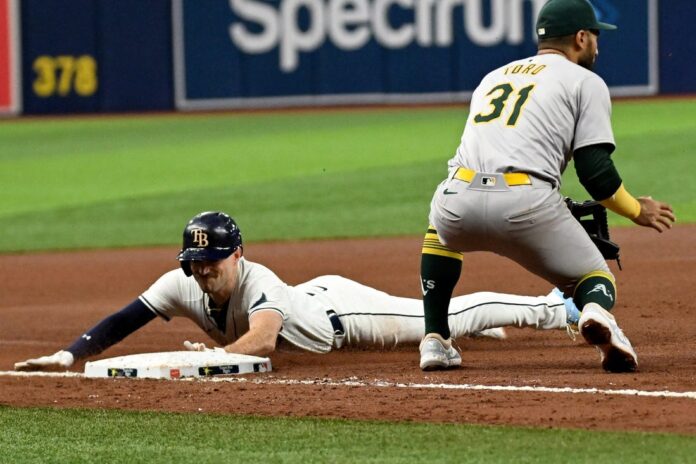 Paredes doubled home Richie Palacios in the seventh to put Tampa Bay up 3-2, but the A’s answered in the eighth with an unearned run, as Bleday singled to drive in Max Schuemann, who had reached on an error.