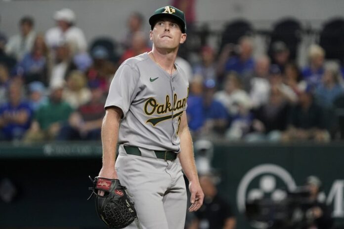 Austin Adams relieved Sears and hit Jonah Heim in the foot but got out of the jam when pinch hitter Jared Walsh’s low looping popup handcuffed second baseman Zack Gelof on the edge of the infield. Gelof recovered to turn a rare 4-1-5-6 double play.