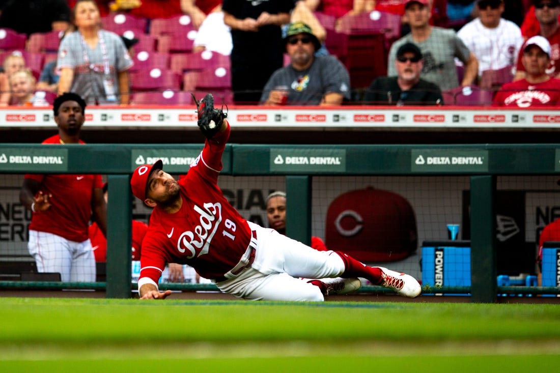 The Giants had another threat in the eighth against lefty reliever Ross Detweiler, putting runners on first and second. Votto battled the shadows to make a key sliding catch in foul territory on a Longoria pop fly. Santillan retired pinch-hitter Thairo Estrada on a grounder to short to end the threat.