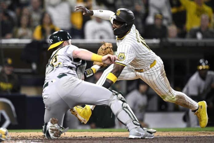 Soderstrom gloved it, but Sears was late to cover the bag and Arraez beat the play at first. Kim never stopped running and beat a rushed throw home from Sears to tie the game. Fernando Tatis Jr. followed with a double off the center field wall, and Jurickson Profar punched a two-run single to right to make it 3-1.