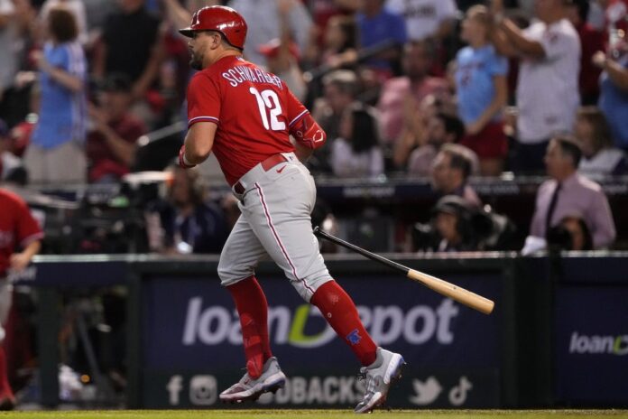 Schwarber snapped the string leading off the sixth inning with his fifth home run of the series, increasing the Phillies’ lead to 3-0.