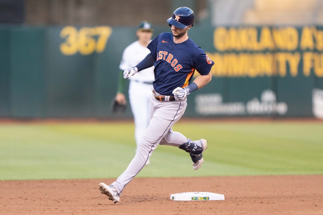 The Astros never trailed in beating the A’s for the eighth consecutive time this season. They gained the upper hand early, when Tucker belted the sixth pitch of the game from JP Sears over the fence in right-center field.