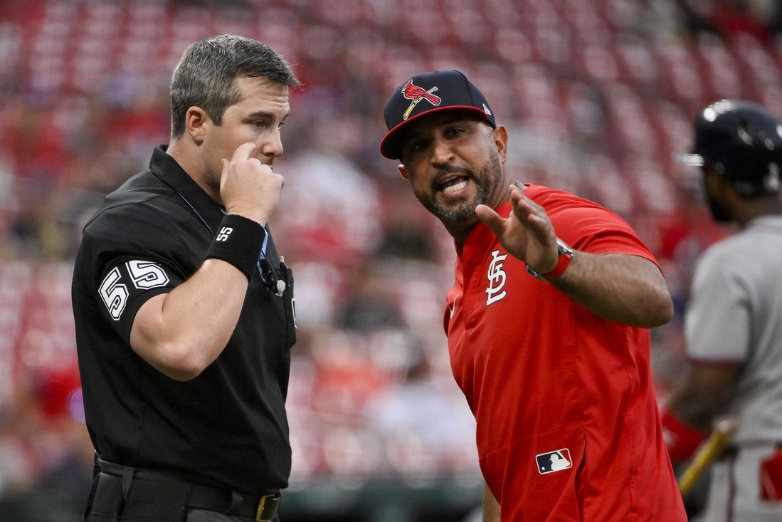 Cardinals manager Oliver Marmol was ejected in the seventh inning of St. Louis’ game with the New York Yankees on Sunday by home plate umpire Nik Lentz for protesting ball-and-strike calls.