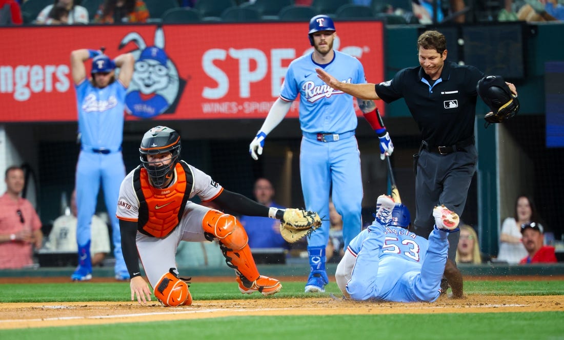 Semien, hit in the helmet by a 94.5 mph fastball by San Francisco starter Keaton Winn leading off the bottom of the first, scored twice and drove in two runs for Texas which snapped a two-game losing streak. Josh Smith singled, walked twice and scored two runs, Ezequiel Duran had two RBIs and Adolis Garcia stole home for the Rangers, who finished with four stolen bases.