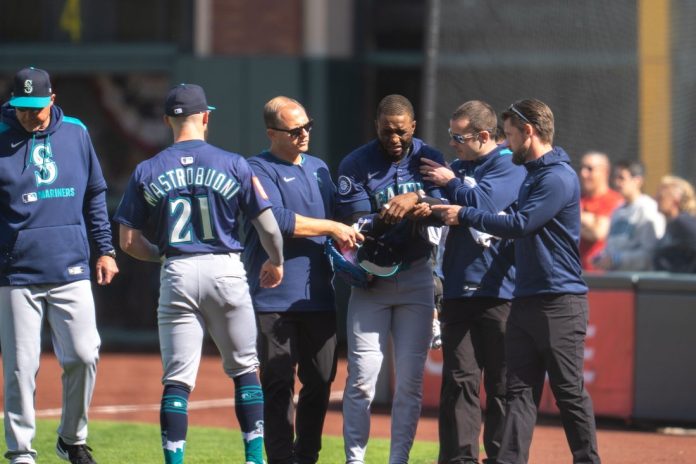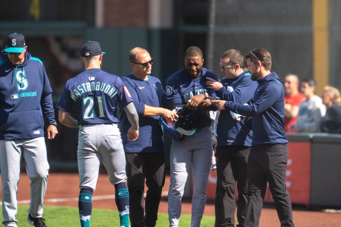 Mariners center fielder Julio Rodriguez, who homered in the first inning, was the first to reach Robles after the injury.