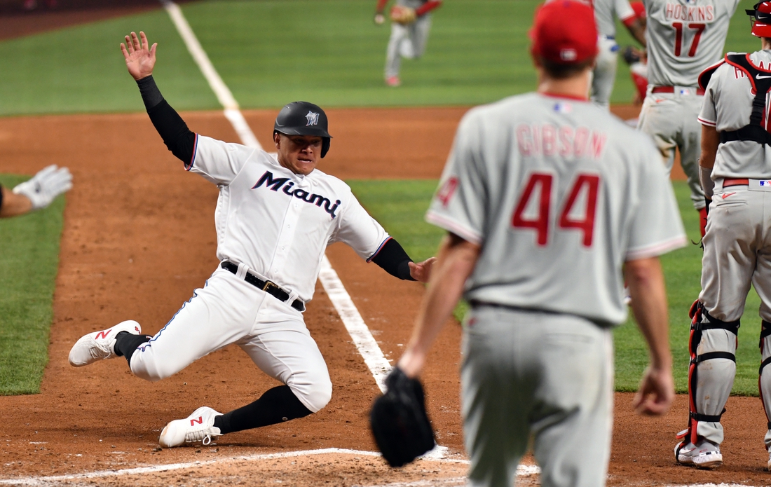 A pair of walks got Gibson in trouble in the fifth, and Miami cashed in as Sanchez lofted an opposite-field RBI single to left, making it 4-1.