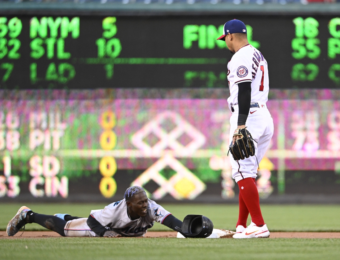 Washington’s Cesar Hernandez reached on Aguilar’s error with two outs in the eighth. Tanner Scott came on and induced an infield pop from Juan Soto, but Chisholm couldn’t make the catch, putting runners on first and third. Scott then walked Josh Bell and Nelson Cruz to force in Washington’s run.