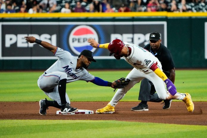 The first five Marlins reached base in the 2-0 first. Xavier Edwards and Jesus Sanchez singled, and Edwards scored on shortstop Perdomo’s fielding error. Ramirez’s ground-rule double drove in Sanchez, and Pfaadt walked Kyle Stowers to load the bases before striking out the side.