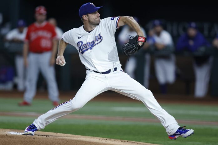 Max Scherzer allowed one hit over seven shutout innings as the Texas Rangers blanked the visiting Los Angeles Angels 12-0 on Monday night to open their three-game series.