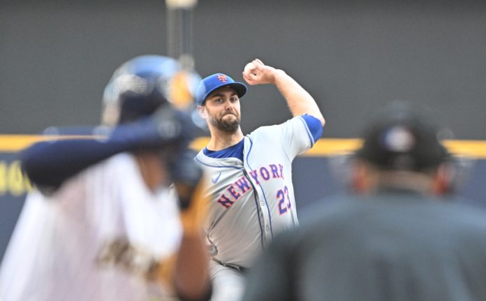 David Peterson tossed seven innings of one-hit ball and earned the win Sunday afternoon for the visiting New York Mets, who ensured themselves an opportunity to play for a postseason berth Monday by beating the Milwaukee Brewers 5-0.