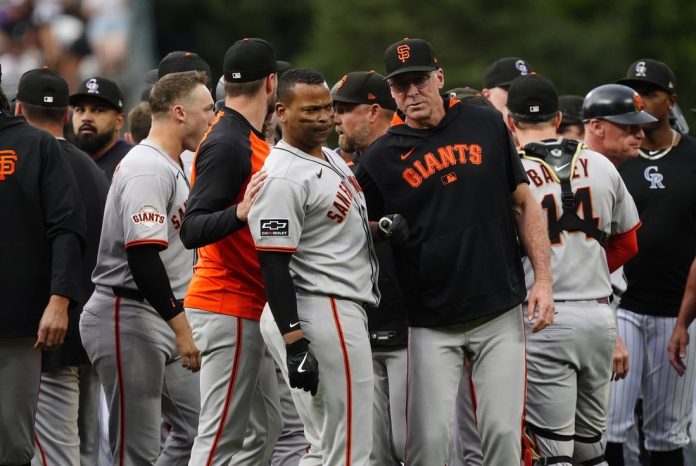 Rafael Devers hit a two-run homer in the first inning that led to the benches emptying and three ejections in the San Francisco Giants’ 7-4 win over the Colorado Rockies in Denver on Tuesday.